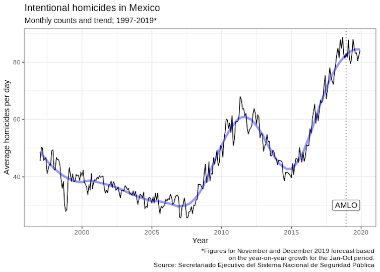 However, the news is hardly a cause for celebration. The current rate – which hovers between 80 and 100 homicides per day – is the highest the country has experienced since current records began in 1997. Sadly, the current lull is no guarantee that homicides will decrease in the future, and they may well increase again – as happened during the presidency of Enrique Peña Nieto between 2012 and 2018.